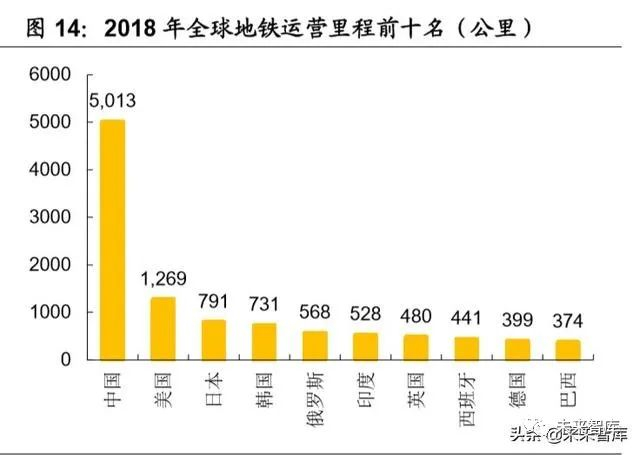 地铁是最主要的城轨交通制式。截至 2018 年底,全球共有 56 个国家和地区的 179 座城市开通地铁,总里程达 14219 公里,车站数超 10631 座。分区域来看, 亚洲地铁运营里程最高,占全球比重为 57.23%;其次是欧洲,总里程为 3569 公里,占比 25.10%;北美洲、南美洲运营里程也超过 1000 公里,占比分别为 9.92%、7.07%。具体国家来看,截至 2018 年底,中国地铁以 5013 公里的总 运营里程排名全球第一,占全球地铁总里程的 35.26%;其次是美国,地铁运营 里程为 1268.7 公里,占比 8.92%;日本排在全球第三,运营里程达 790.6 公里。