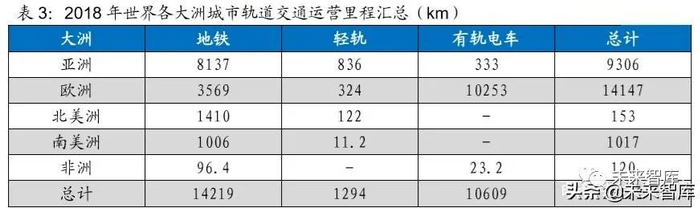 全球城轨交通集中分布于亚欧,我国位列首位:截至 2018 年底,全球有 72 个 国家和地区的 493 座城市开通了城市轨道交通系统,里程超过 2.61 万公里,其 中地铁、轻轨、有轨电车各占 54%、5%和 41%。从分布区域看,全球城轨交 通主要集中在亚欧大陆的城市,占全球的 90%。其中地铁和轻轨主要分布在以 中国为代表的亚洲国家,有轨电车集中分布在欧洲尤其是西欧国家。从制式看, 亚洲地铁和轻轨里程最长,各占全球地铁和轻轨里程的 57%和 65%;欧洲有轨 电车里程最长,占全球有轨电车里程的 97%。