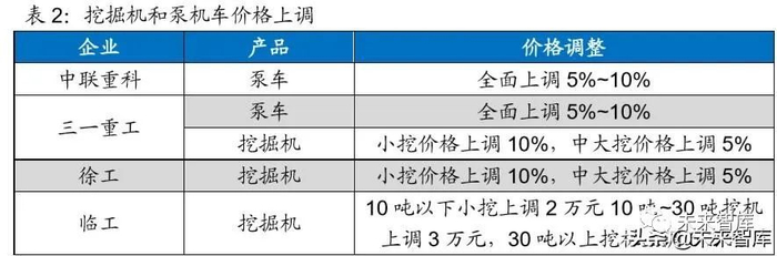 多家头部企业发布涨价通知,工程机械量价齐升。受海外疫情影响,工程机械 零部件供应压力增加,供应链成本上升。日前中联重科、三一重工、徐工、柳 工、临工、山推、玉柴、雷沃、山河智能等企业纷纷上调了部分产品价格,小挖 平均提价 10%、中大挖平均提价 5%,推土机与平地机涨价 2 万-5 万元不等, 起重机价格上调 5%-10%。同时,国内疫情防控好转,产业加速复产复工,出 台多项逆周期调节政策来扩大内需,3 月基建地产投资增速回升,工程机械 供不应求,行业旺季已至。