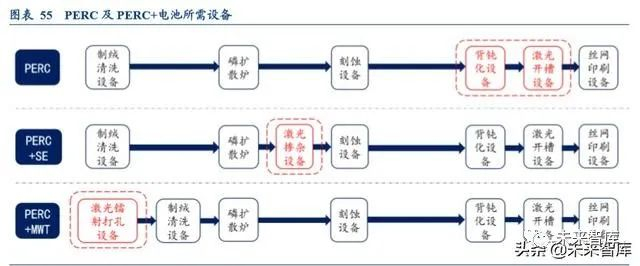 PERC 技术日趋成熟,“PERC+”成为 PERC 工艺升级,提升光电转换效率的重要方向,目前,PERC 工艺升级路 线主要包括 PERC+SE、PERC+MWT、双面 PERC 等。