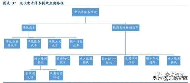 从产业发展规律看,一种电池技术若要成为有竞争力的主流技术,需要能够达到降低 LCOE 的目标,即降低成本的 同时提升发电效率。太阳能电池转换效率损失的主要原因包括载流子损失、欧姆损失和光学损失,改善的途径主要 有:减少反射损失,如:采用减反膜、采用凹凸结构;表面钝化技术;减少投射损失;设计 p-i-n 结构;采用纳米结 构;增加导电通路,减少遮光损失等方式。从成本角度看,电池片成本的下降来源于原材料成本降低、设备效率提 升和成本下降、工艺成本降低以及电池转换效率的提高。