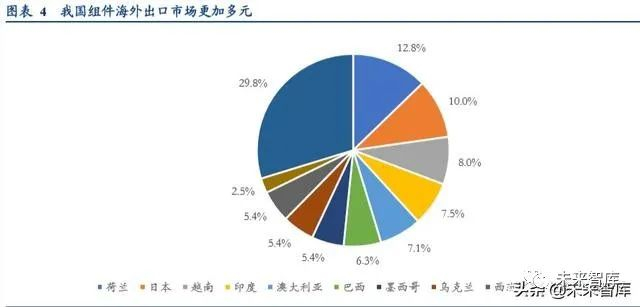 海外市场多点开花,需求欣欣向荣。据彭博新能源数据,2018 年光伏装机规模超过 1GW 的国家或地区数量达到 13 个,2017 年为 9 个,CPIA 统计数据显示,2019 年新增光伏装机超 GW 级的市场数量预计在 16 个以上,包括:中国 大陆地区、中国台湾地区、美国、印度、日本、越南、澳大利亚、西班牙、德国、墨西哥、乌克兰、荷兰、巴西、 韩国、阿联酋、巴基斯坦等。2019 年我国光伏组件出口金额 173.1 亿美元,其中超 1 亿美元的市场有 28 个(2018 年 22 个),超 10 亿美元的有 6 个(2018 年 4 个),出口量超过 1GW 的国家和地区共 15 个(2018 年为 11 个)。过去过度依赖单一市场的格局正被打破,全球光伏市场逐步呈现多点开花的局面。