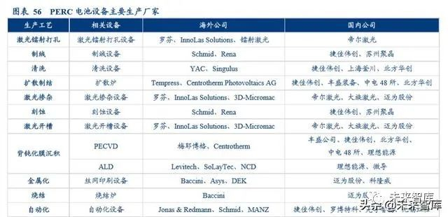 PERC 电池设备基本完成国产化,成本实现大幅降低:PERC 及 PERC+通过在原有产线增加设备即可实现技术改进 升级,我国太阳能电池制造设备企业已具备成套工艺流程设备供应能力,制绒清洗设备、扩散炉、等离子刻蚀机、 激光开槽、激光掺杂等环节国产设备已占据主导地位。