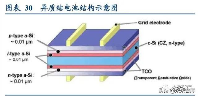 相比其他技术路线的电池,HIT 电池优势在于:1)具有天然的双面对称结构,双面受光,双面率高于 90%;2)相 比其他工艺流程更加简洁,仅为 4 步;3)高开路电压,有利于获得较高的光电转换效率;4)无 LID 和 PID 效应, HIT 电池采用 N 型硅片作为衬底,从根本上避免了由于硼氧复合因子带来的光致衰减现象;5)低温制造工艺(低于 200℃),可降低制造流程中的能耗及对硅片的热损伤;6)温度系数低,在高温及低温环境下均具备较好的温度特 性。以 N 型硅片为衬底,经过制绒清洗后,在正面依次沉积 5-10nm 本征非晶硅薄膜和掺杂 P 型非晶硅薄膜,与硅衬底形成异质结,背面通过沉积 5-10nm 的本征非晶硅薄膜和掺杂 N 型非晶硅薄膜形成背表面场。在掺杂非晶硅薄 膜表面沉积 TCO 透明导电氧化物薄膜,最后在正背表面印刷金属集电极。