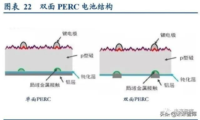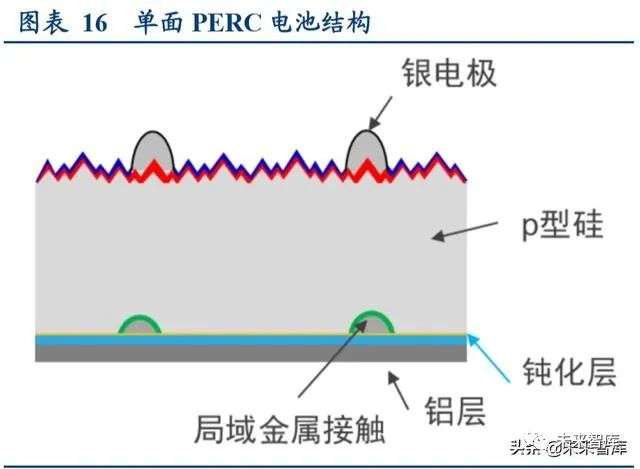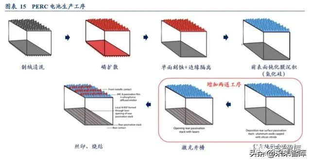 PERC 技术仅需在 BSF 基础上增加两道工序即可完成升级改造:PERC 技术在常规 BSF 电池基础上增加背面钝化层 沉积和激光开槽两道工序,此外,针对背部抛光需对基于化学湿台的边缘隔离步骤稍作调整,即可实现传统 BSF 电 池产线向 PERC 产线的升级。背钝化层主要采用氧化铝作为背钝化材料(氧化硅、氮氧化硅也可作为背钝化材料), 氧化铝由于电荷密度较高,可降低背表面少子的复合速率,钝化效果较好,同时为保证电池背面的光学性能,还会 在氧化铝表面覆盖一层氮化硅膜作为保护层。为使背面金属电极与硅形成良好的欧姆接触,需要对钝化层进行刻蚀,目前主流工艺采用激光开槽的方式来完成这一工序。