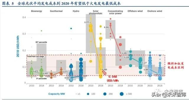 光伏安装成本已大幅下降,大规模应用前景可期:技术迭代带动光伏发电成本不断降低,截至 2018 年,太阳能安装 成本相比 2010 年已实现大幅下降。据 IRENA 统计,自 2014 年全球光伏加权发电成本已落入化石燃料发电成本区间 内,预计到 2020 年光伏发电成本将进一步降至 0.048 美元/kwh,低于化石燃料最低发电成本,届时 83%的光伏项目 发电价格将低于化石能源价格,经济性更加凸显。