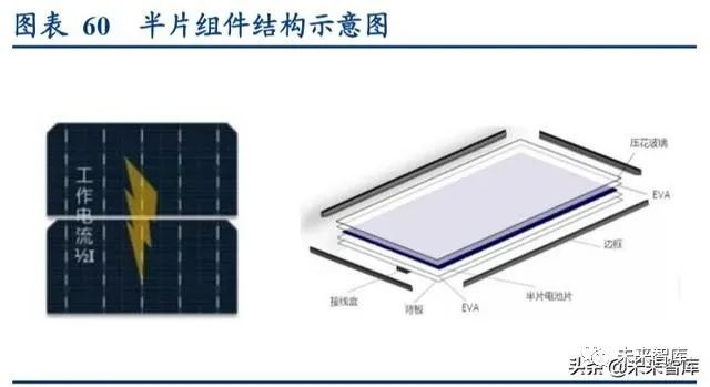 半片组件迎来快速发展:半片组件技术是使用激光切割法沿着垂直于电池主栅线的方向将电池片切成尺寸相同的两 个半片电池片,由于电池片的电流和电池片面积有关,切割后就可以把通过主栅线的电流降低到整片的 1/2,当半片 电池串联以后,正负回路上电阻不变,功率损耗就降低为原来的 1/4,从而最终降低了组件的功率损失,提高了封装 效率和填充因子。以隆基在海南琼海的实证电站测试数据为例,半片双面组件相对于整片双面组件平均发电增益为 2.8%。设备方面,相比于全片技术,半片技术前端增加了切割电池片的步骤,同时需要对串焊及层压过程进行适当 的调整,与传统产线设备兼容性高,新增投资少。半片技术的难点在于汇流带引出线从组件背面中间引出时人工操 作加大了引出线处电池裂片或隐裂的风险,目前汇流带焊接自动化难题已被攻克,半片技术迎来快速普及,半片几 乎成为新扩产组件的标配。据 CPIA 统计,2019 年全片组件市场占比约为 77.1%,较 2018 年下降了 14.6 个百分点。