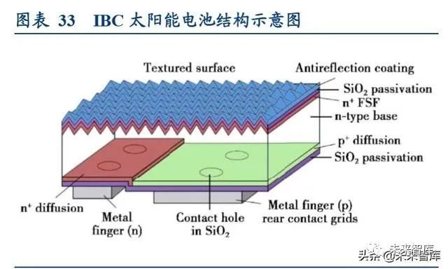 IBC 电池(交叉指式背接触太阳能电池):IBC 电池以 N 型硅为衬底,PN 结和金属接触均位于背表面,成叉指状 排列,避免了金属栅线电极对光线的遮挡,前背表面均采用氧化硅/氮化硅叠层作为钝化层,结合前表面金字塔绒面 结构能够减少光学损失,最大程度地利用入射光,具有更高的短路电流。在正面无栅线遮光和金属接触的条件下, 可对表面钝化及陷光结构进行最优化设计,降低前表面复合速率。背表面采用扩散法形成 p+和 n+交错间隔的交叉式 电极接触高掺杂区,通过在钝化膜上开孔,实现金属电极与发射区的点接触连接,降低载流子的背表面复合速率。由于采用背接触结构,串联电阻低于传统电池,具有较高的填充因子。此外,IBC 电池外形美观,具有较好的商业 化前景。缺点在于背表面需要多次掩模和光刻技术,工艺步骤多且复杂,结构设计难度大。
