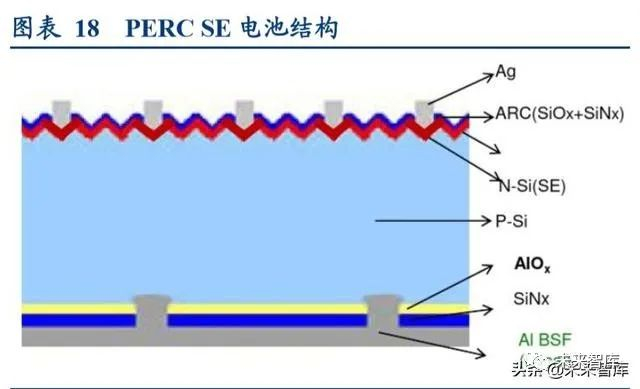 PERC+SE 技术带来 0.2%~0.3%的转换效率提升,与现有 PERC 产线兼容性较高,已成为主流标配技术:PERC+SE 技术以扩散后的 PSG 层为磷源,利用激光可选择性加热的特性,在电池正表面电极位置进行磷的二次掺杂,形成选 择性重掺 N++层,可降低硅片与电极之间的接触电阻,降低表面复合,提高少子寿命,同时还能改善光线短波光谱 响应,提高短路电流与开路电压,进一步提升电池效率。相比 PERC,SE 技术可带来 0.2%~0.3%的转换效率提升。