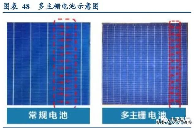 多主栅结合半片技术有望成为高功率组件主流趋势:多主栅技术的栅线分布更密,抗隐裂能力也更强,能够降低遮 光面积并减少电阻损耗,提升组件功率输出,并通过降低银浆用量控制成本,提升组件功率,有效降低度电成本。多主栅电池组件的技术难点主要体现在电池片分选、组件串焊、组件叠层等方面,其中对电池片分选的精准度要求 更高,串焊过程中需要高精准定位金属化图案的位置,对焊接对准、焊接牢固程度要求更高,因此需要使用新的串 焊机。此外,为将栅线做细,还需要新的网版。热焊接方式与传统产线兼容性高,技术成熟度高,是目前的主流方 案。具有低热斑风险的半片结合低裂片影响的 MBB,可有效降低组件失效风险,逐渐成为高密度、高功率组件的主 流趋势。尽管 2019 年电池组件市场仍以 5BB 为主流(CPIA 数据显示,5BB 技术市场占比超过 75%),但自 2019 年以来,半片+多主栅已成为组件技术技改或扩产的标配,并有望在 2020 年陆续释放高效产能。