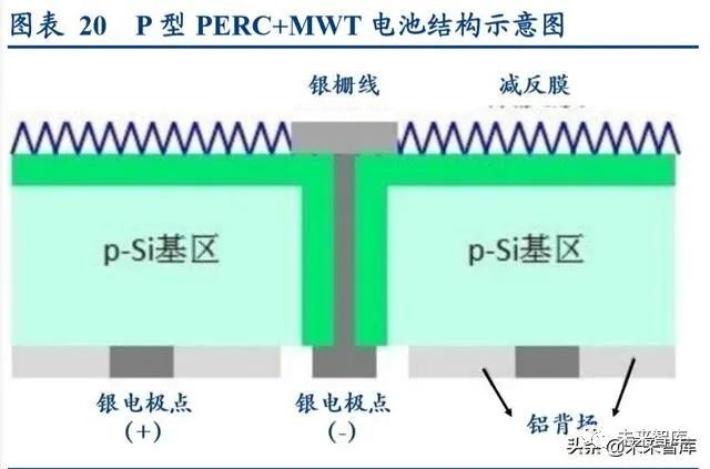 MWT 工艺可实现 0.4%的效率提升,产线改造仅需增加激光镭射打孔设备:采用激光打孔、背面布线的技术消除正 面电极的主栅线,细栅线搜集的电流通过孔洞中的银浆引到背表面,使得正负电极均分布在背表面,有效减少正面 栅线的遮光,降低金属电极-发射极界面的载流子复合损失,提高光电转化效率,同时降低银浆消耗量,从而进一步 降低成本,MWT 技术可实现约 0.4%的转换效率提升。由于 MWT 电池正负电极点均分布于背表面,且不在一条直 线上,常规焊带焊接互联方式无法适用,因此,MWT 组件采用金属箔作为导电背板,在金属箔上进行电路设计,每 片电池片通过导电胶和金属箔电路互联形成完整的电流回路,再利用胶膜等封装材料封装,省去了复杂的高温焊接 过程,避免了焊接应力和微裂导致的性能衰减,更容易实现自动化和高产能,降低了破片率。MWT 工艺同样具备良 好的产线兼容性,额外增加的关键步骤为在硅片、铜箔及封装材料中精确打孔,通过在前端增加激光镭射打孔设备 即可实现。