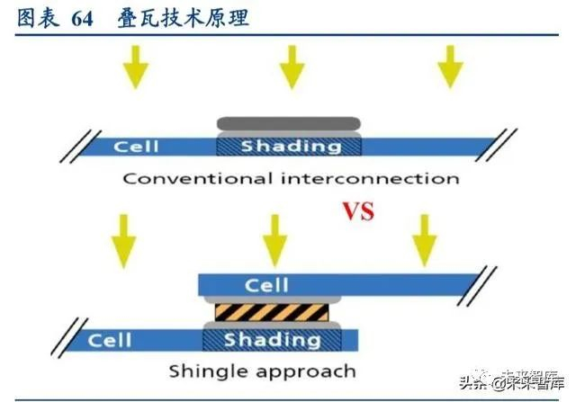叠瓦组件是利用切片技术将栅线重新设计的电池片切割成小片(1 切 5 或 1 切 6),将每小片叠加排布,用导电胶材 料焊接制作成串,再经过串并联排版后层压成组件,使电池以更紧密的方式互相连结,从而在相同面积下放置更多 的电池片,此外无焊带的设计避免了焊带遮挡,减少了组件线损,降低了电池片互联电阻,使得组件功率大幅提升。在可靠性上,叠片的连接方式可分解电池片所受应力,比传统组件更好地承受机械载荷,且隐裂更少。叠瓦技术的 难点在于:1)涉及到激光切割损伤,容易造成电池效率降低;2)不同材料导电胶的热膨胀系数存在差异,需要综 合考虑导电胶与其他材料的匹配性和综合老化性能;3)栅线设计。
