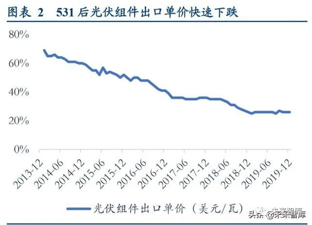 部分国家已实现平价上网,海外需求释放支撑制造端增长:531 新政后,光伏组件出口单价快速下跌,截至 2019M12, 已降至 0.26 美元/瓦,相比 531 前跌幅 23.5%,刺激海外装机需求释放。2019 年海外新增光伏装机量 90.9GW,同比 增长 81%,其中有 17 个市场体量超过 1GW。我国光伏组件出口量 63.5GW,同比大幅增长 61.6%。