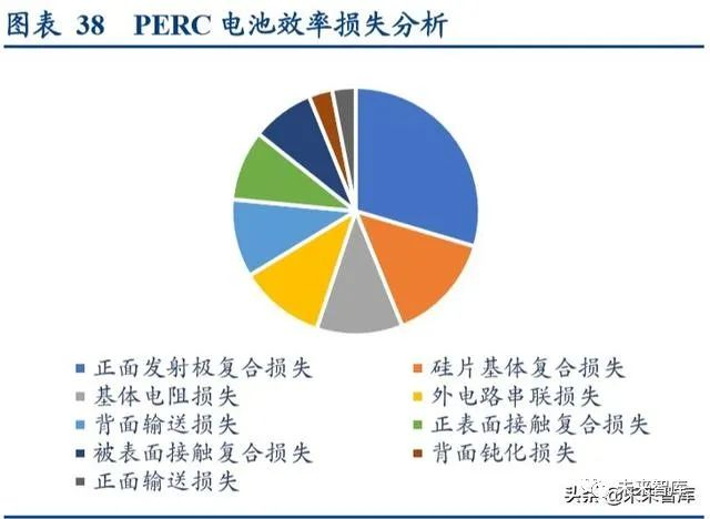 相比 BSF,PERC 更具效率优势:PERC 电池(钝化发射极和背面电池)起源于上世纪 80 年代,并自 2015 年开始 逐步市场化。PERC 电池通过在电池背面增加钝化层,阻止载流子的复合行为,减少电损失,同时增强电池背表面 光反射,减少光损失,进而提高电池转换效率和电池性能。PERC 电池内部反射增强,有效降低了长波的光学损失, 背面钝化提升了开路电压和短路电流,使得电池转化效率相比传统 BSF 电池更高。2019 年 PERC 电池的平均量产 效率已经从 2014 年的 20.1%提升至 22.3%~22.5%,平均每年提升 0.5%。
