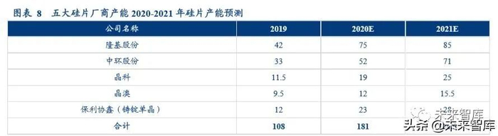 硅片环节开启新一轮产能扩建,落后产能有望加速淘汰,头部化趋势愈发明显:随着光伏平价空间打开,需求逐步 释放,我们认为光伏硅片环节有望迎来新一轮优质产能扩建潮,主要原因在于:1)未来光伏高效化趋势明确,然而 目前大尺寸硅片产能有限,2019 年 156.75mm 尺寸硅片市场占比仍然高达 61%,158.75mm 尺寸硅片占比 31.8%,而 166 及 210mm 硅片占比则不到 8%,未来专业化龙头公司或加速扩产构筑规模壁垒以提升自身在大尺寸硅片领域的话 语权,大尺寸硅片市场份额有望快速提升;2)以晶科、晶澳为代表的垂直一体化厂商为保证内部供应能力,规划积极提升硅片环节产能以应对自身组件产能扩张;3)技术迭代及效率提升导致新产能成本大幅优于老产能,带动存量 替换趋势,新产能扩建加速老产能出清过程,尾部产能被替代,新产能获得生存空间。考虑到头部公司扩产带来的 规模效应更加明显,未来市场集中度有望进一步提升。目前隆基、中环、晶科、晶澳以及保利协鑫均在积极布局大 尺寸单晶硅片产能扩张,结合各公司产能规划,预计 2020-2021 年,五家公司单晶硅片产能有望分别达到 182 和 224.5GW,产能分别增加 74 和 42.5GW。