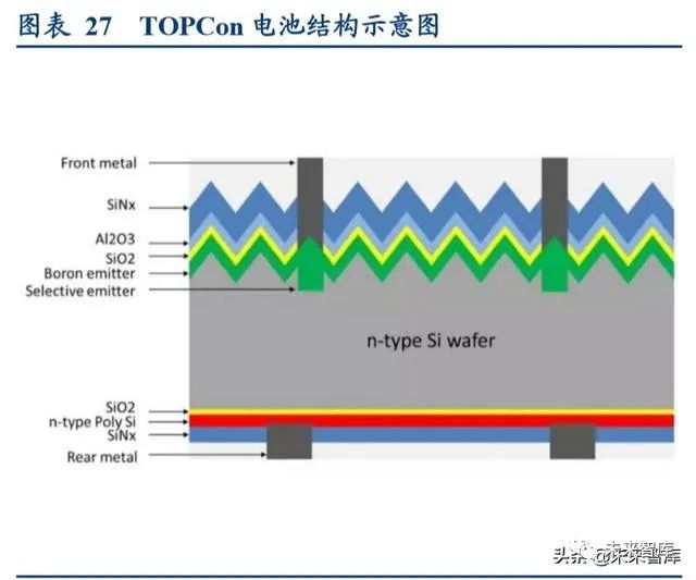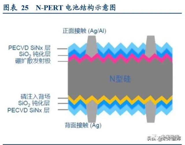 PERT 电池(钝化发射极背面全扩散电池)使用少子寿命高的 N 型硅片作为衬底,电池几乎无光致衰减,正面使用 硼扩散形成发射极,背面采用磷全扩散,是钝化接触工艺流程中的入门级结构。N-PERT 电池工艺的关键在于双面 掺杂和双面钝化技术。正面扩硼主要采用液态三溴化硼管式扩散方式,相比其他扩硼方式更有利于避免金属污染, 背面磷背场可通过热扩散和离子注入的方式形成,热扩散工艺由于涉及二次扩散,需要额外的掩模工艺和清洗工艺 以及特殊的边缘隔离,提升了制造的成本和复杂性,而离子注入可实现单面掺杂,均匀性好,可简化制造流程。表 面钝化方面,背表面采用氧化硅/氮化硅叠层钝化膜可以起到良好的表面钝化和场钝化效果,正表面使用氧化铝钝化 膜则效果更好。2019年4月,IMEC及其合作伙伴EnergyVille与中来合作开发的N-PERT电池正面转换效率已达23.2%。相比于 P-PERC,N-PERT 需要增加硼扩散和清洗步骤,且由于在效率提升方面不及 PERC,开始逐步向 TOPCon 钝化接触工艺进行升级。