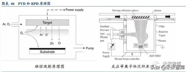 TCO 主要改进在于沉积方法和材料。HIT 表面的 TCO 薄膜的作用为收集光生载流子并将其输送到金属电极上,导 电性好、透过率高是 TCO 薄膜需要具备的关键特性。在工艺方面,目前主要采用 PVD(磁控溅射)和 RPD(反应 等离子体沉积法)两种方式,PVD 利用经过加速的高能粒子轰击靶材,使靶材表面的原子脱离晶格逸出沉积在衬底 表面发生反应而形成薄膜;RPD 法利用等离子体枪产生氩等离子体,氩等离子体进入生长腔后,在磁场作用下轰击 靶材,靶材升华形成蒸气实现薄膜沉积。PVD 技术的优势在于设备成本较低,成膜均匀性更好,镀膜工艺稳定,能 够满足大规模产业化需求,但由于等离子体中包含大量高能粒子,会对基板表面产生强烈的轰击刻蚀作用。而 RPD 技术的等离子体能量分布相对集中且离化率更高,高能离子较少,表现出低离子损伤的优良特性。同等条件下,RPD 技术制备的 TCO 薄膜结构更加致密、结晶度更高、表面更加光滑、导电性更高、光学透过率更好1。此外,RPD 方 法还具备低沉积温度、高速生长等优点,缺点在于设备成本较高。