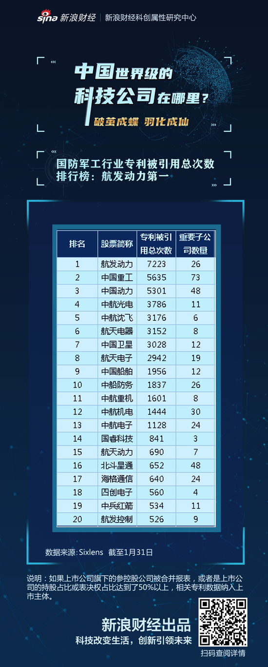 国防军工行业专利被引用总次数排行榜:航发动力第一