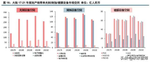晶圆制造环节一:光刻环节的光刻机、电子束曝光、涂胶显影、去胶设备的空间增量为 1276 亿/63 亿 /314 亿/49 亿元;刻蚀设备中介质刻蚀、硅刻蚀、金属刻蚀、化合物半导体刻蚀、电子束刻蚀对应增量为 535 亿/513 亿/45 亿/11 亿/11 亿;镀膜设备中的 PVD、ALD、CVD/LPCVD、PECVD、VPE 对应的空间为 287 亿/85 亿/287 亿/278 亿/123 亿。