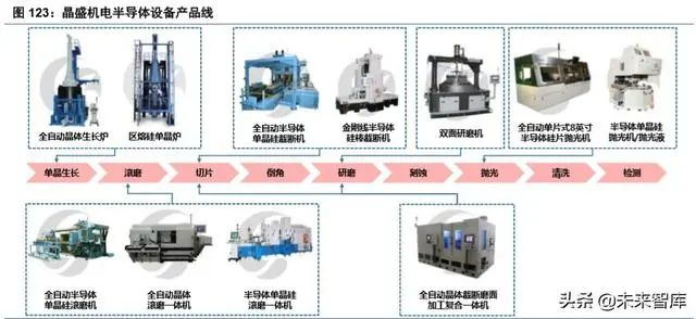 晶盛机电:布局硅片环节,包括长晶设备、切片设备、加工设备等。2007 年研制出国内首台全自动直 拉式单晶炉;2009-2011 年承担了 02 专项中“300mm 硅单晶直拉生长装备的开发”和“8 英寸区熔硅单晶 炉国产化设备研制”两个项目;2012 年实现半导体级单晶硅棒的研制,次年成功研制区熔单晶炉;2014 年区熔单晶炉商业化。目前,晶盛机电已成长为国内单晶炉研制的龙头企业,产品应用于光伏、集成电路、 LED 等,客户包括有研半导体、郑州合晶、金瑞泓、天津环欧、中环、宜昌南玻、包头晶澳等,其中中环 为第一大客户。
