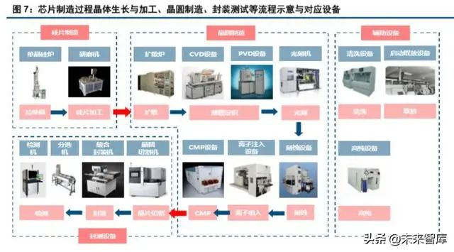 设备属于半导体产业链上游,一般需要提前 1 年下单订货,是未来晶圆制造产能供给先行指标。随着 制程往先进演进,对设备性能和稳定性要求提升,具备高壁垒、高毛利率、验证周期长等特点。芯片制造 过程包括,硅片制造、晶圆制造、封装检测等不同环节,对应设备为硅片制造设备(长晶、研磨、抛光)、 晶圆前道设备(光刻、涂胶显影、刻蚀、PVD/CVD、氧化扩散热处理、离子注入、CMP、清洗、过程控制)、 晶圆后道设备(焊线机、分选机、探针台、划片机)、辅助设备(搬运仓储、气体纯净系统)等。