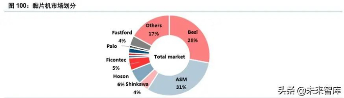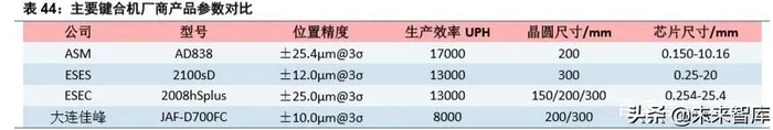 2)贴片机(黏片机):主要功能是将芯片安装固定在封装基板或外壳上。国际上贴片机型涵盖 150mm、 200mm 和 300mm 晶圆,主流为 300mm,其关键技术是整机运动控制、芯片拾放和图像识别。对于芯片拾 放,要求速度快、精度高。黏片机的主要厂商包括 Besi、ASM、ECSC、Hoson 等厂商,国内厂商主要有大 连佳峰自动化、上海螣芯电子等,其定位精度、生产效率和适用芯片尺寸与国际厂商产品仍有差距。