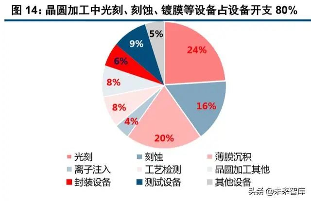 从晶圆线投资额细分看,半导体设备投资占产线总投资的 75%-80%。而设备投资中,晶圆制造环节占 比约 80%,封装环节占比约 6%,测试环节占比约 9%。晶圆制造相关设备中,光刻/镀膜/刻蚀等环节占比 较高,分别为 24%、20%、16%,而离子注入、工艺检测、晶圆加工其他占比为 4%、8%、8%。考虑市场空 间及技术成熟度,刻蚀/镀膜环节国内厂商替代潜力较大,国内刻蚀设备龙头、中微公司有望份额提升。
