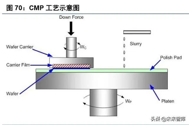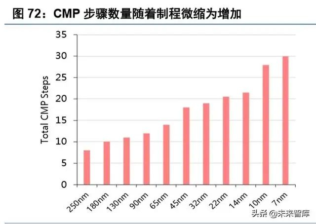 随着晶圆制程工艺发展,所需 CMP 次数增多,CMP 设备和 CMP 材料的需求也大幅提升。以存储器为 例,3D NAND 的平均 CMP 次数约等于 2D NAND 的两倍,其中针对非钨材料的 CMP 次数超过 60%(集成电 路中用大量的金属钨作为导线以传递电信号,这些金属钨需要抛光处理)。而在晶圆制造的整个环节中, 随着工艺制程从 250nm 微缩到 7nm,CMP 次数合计从 8 次增加到 30 次。