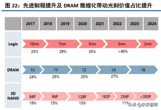 随着先进制程从10nm往5nm/3nm节点演进,逻辑芯片晶圆制造中光刻价值占比从25%提升至35%+, 提升较明显。DRAM 从 1X 往 1A 演进,也将带动光刻价值占比从 24%提升至 27%。设备端看,EUV 和 ArFi 光刻机占比约 8 成,其中 EUV 光刻占比提升显著,国内厂商有望从 ArF 和 KrF、I-Line 光刻机等逐步切入。