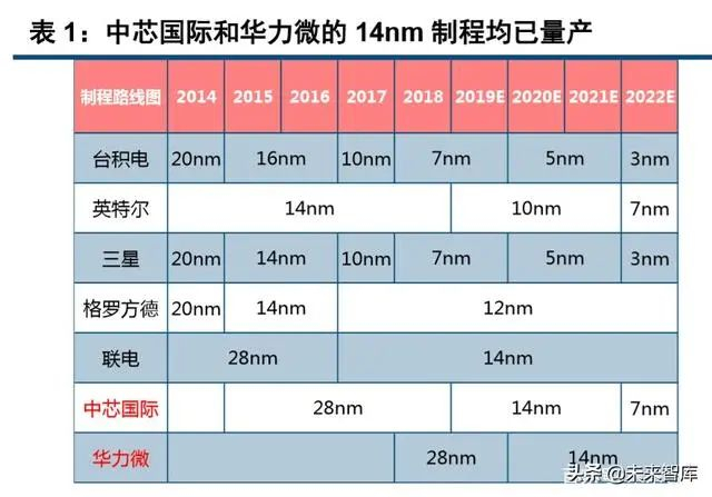 28 纳米属于单位逻辑闸成本最低的技术节点,长周期制程属性明显,17 年单是 28nm 制程全球规模约 110 亿美金,28nm 及以上规模占比 76%,市场空间约 470 亿美金,国内厂商在 28nm 及以上制程发展潜力 巨大。而 14nm 制程主要用于中高端 AP/SoC、GPU、矿机 ASIC、FPGA、汽车 IC 等,市场规模稍高于 28nm, 但整体竞争不激烈。中短期看,中芯国际、华力微等在 28nm 及以上制程具备竞争力,有望与 GF 和联电 竞争。中芯国际 19Q4 营收 28nm 占比约 5%,40/45nm 约 16%,55/65nm 约 31%,0.15/0.18um 占比 35%。14nm 首次贡献营收,占比约 1%,28nm 和 14nm 营收占比提升空间较大。随着 28nm 制程逐渐成熟,28nm 及以上能满足大部分 IC 产品制程需求,是国内代工企业主战场,而 14nm 技术突破后也将逐渐量产出货。