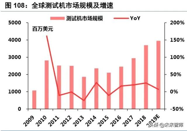 从市场空间看,测试机市场快速成长,2018 年达 37 亿美元。根据 VLSI,2018 年全球测试机市场规模 达 37 亿美元,同比增长 25.5%。爱德万预计 2019 年存储器测试机将成为高增长点,存储器测试机市场将 增长 20%,非存储器测试设备市场增长 5%,测算 2019 年全球测试机市场规模达 39.5 亿美元。随着封测产 业开始新一轮景气周期,测试设备进入上升周期。国内模拟测试机市场规模为 4.3 亿元,国内 SoC 类测试 机市场规模约为 8.5 亿元,约为模拟测试机市场 2 倍,本土企业有望从模数混合逐渐向 SoC 测试机突破。