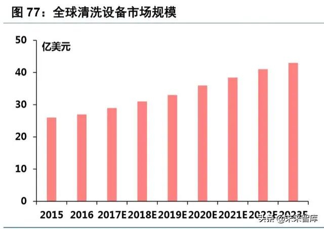 清洗设备市场规模约 31 亿美元,日系厂商占主导。从市场空间看,根据盛美半导体和 TMR 的数据, 2018 年清洗设备市场规模约 31 亿美元,预计 2023 年可达 43 亿美元,2018-2023 年 CAGR=6.8%。从市场 竞争看,全球晶圆清洗设备市场主要由 Screen(DNS)、 TEL、KLA、泛林等厂商主导,前三名市占率分别为 54%、23%和 10%。根据 Gartner,Screen 是清洗设备的龙头厂商,在单片清洗设备市场,Screen 市占率高 达 55%,自动清洗台市场,Screen 市占率 50%以上,洗刷机市场,Screen 市占率高达 60%以上。
