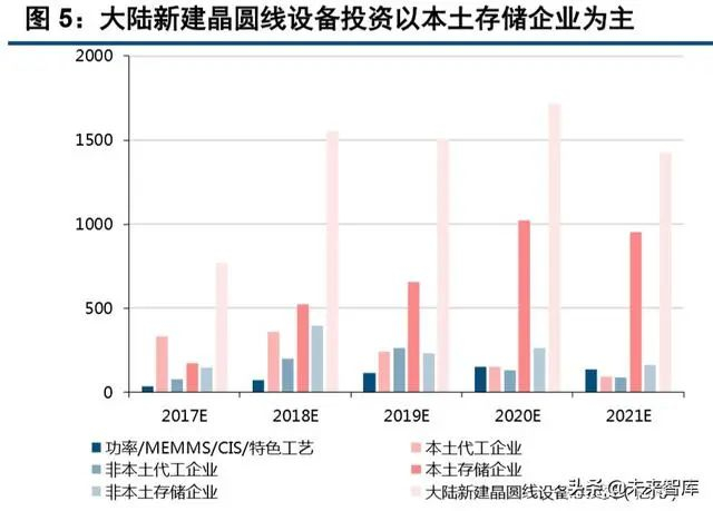 存储是新线重点,投资占比高达 65%,其中本土存储占比 48%(紫光/长江存储/合肥睿力/福建晋华), 非本土(Intel/三星/海力士)为 17%。而中芯/华力微/芯恩/粤芯等本土代工投资占比为 17%,台积电/联电/GF 等非本土代工占比 11%,剩余 7%为士兰微、华润微、积塔等功率器件/特色工艺等。其中 96%为 12 寸 线建设,功率器件等相关的 8 寸线占比仅 4%。规划涉及设备投资总额约 8800 亿元,根据建设进度预计设 备订单释放时间,对应 2017-2021 年每年半导体设备需求约 769、1551、1504、1719、1427 亿元。