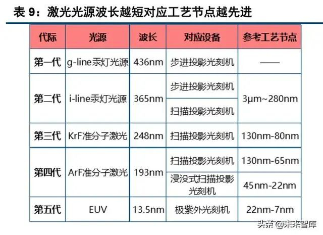 随着分辨率需求不断微缩,根据所使用的光源的改进,光刻机经历了 5 代产品的发展。光刻机主要指 标为分辨率、套刻精度和产率,未来的发展趋势将主要围绕以上三个指标。照明波长不断变短、物镜的数 值孔径不断变大,使得光刻机的分辨力能力不断提高,当前 EUV 分辨率达到 13nm,通过多重曝光能够实 现 7nm 工艺制造,并向 5nm 和 3nm 技术节点前进。同时,套刻精度随着分辨率不断提高,产率不断优化, 使得芯片整体生产成本持续降低。