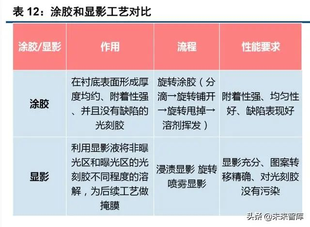 涂胶显影设备是光刻工序中与光刻机配套使用的涂胶、烘烤及显影设备,包括涂胶机(又称涂布机、 匀胶机)、喷胶机和显影机。在早期的集成电路和较低端的半导体制造工艺中,此类设备往往单独使用(Off Line)。随着集成电路制造工艺自动化程度及客户对产能要求的不断提升,在 200mm 及以上的大型生产线 上,此类设备一般都与光刻设备联机作业(In Line),组成配套的圆片处理与光刻生产线,与光刻机配合 完成精细的光刻工艺流程。