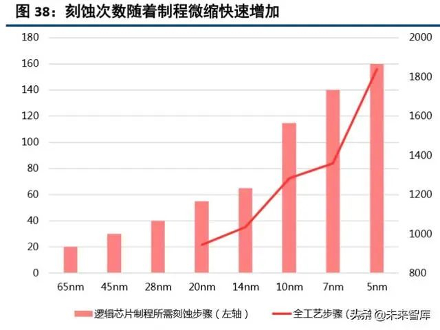 先进制程及芯片微缩带动设备需求,刻蚀行业迎增量。受限于 193nm 的浸没式光刻机限制,晶圆制造 向 7 纳米、5 纳米以及更先进的工艺发展,除了采用昂贵的 EUV 光刻机之外,14nm 及以下的芯片制造很 多都通过多重模板效应来实现制程微缩,刻蚀加工步骤增多。10nm 制程是关键节点,相较于 14nm,其刻 蚀步骤为 115 步,增加 77%,到 5nm 制程刻蚀步骤将是 14nm 的 2.5 倍及以上。全球刻蚀设备市场规模目前约 75 亿美金,2025 年有望增至 140 亿美金左右,年复合增长率为 11%,行业规模稳健增长。