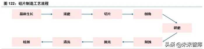 硅片制造设备将纯净的多晶硅材料制造成一定直径和长度的硅单晶棒,然后将硅单晶棒经过一系列的 机械加工、化学处理等工序,制造成具有一定几何精度要求的硅片或外延片,为集成电路制造提供所需硅 衬底。硅片制备的一般流程为:晶体生长→滚磨/整形→切片→退火→倒角→研磨→刻蚀→抛光→清洗→检 测,涉及众多专用设备,其中单晶炉、抛光机和检测设备是核心设备,其投资额分别占设备投资的 25%、 25%和 15%。