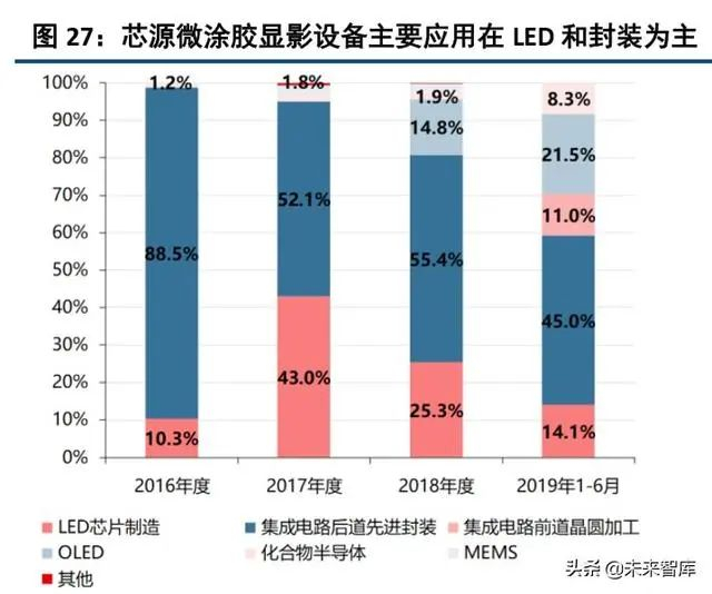芯源微:前身为先进制造和韩国 STL 共同出资设立的沈阳芯源先进半导体,于 2008 年和 2012 年承担 国家 02 专项 “凸点封装涂胶显影、单片湿法刻蚀设备的开发与产业化”和“300mm 晶圆匀胶显影设备研发” 两个课题。其涂胶显影设备主要应用在后道先进封装和 LED,在先进封装市场占有 19%的市场份额。(略)