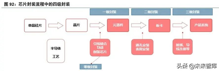 3) 二级封装(Board level,PCB 级封装)和三级封装(System level,整机组装):主要有通孔插装技术 (THT)和表面贴装技术(SMT),涉及的设备有点胶机、回流炉、贴片机、封焊设备、清洗机、自 动光学检测设备等;