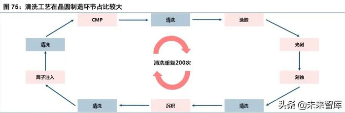 晶圆清洗是晶圆制造中频率最高的工艺,占比达 33%,一个流程中需要多次清洗。根据盛美半导体, 一个完整的工艺流程包括:CMP→清洗→涂胶→光刻→刻蚀→清洗→沉积→清洗→离子注入→清洗→CMP, 该流程往往循环多次,清洗重复达 200 次。相比于干法清洗,湿法清洗更加高效,90%的清洗为湿法清洗。