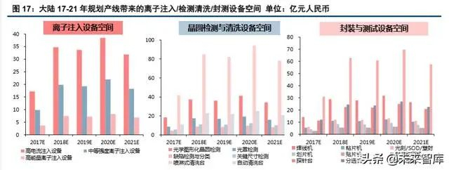 晶圆制造环节二:离子注入设备中高电流注入、中等强度离子注入、高能量离子注入的空间为 156 亿 /89 亿/34 亿元;晶圆检测设备中的光学图形化晶圆检测、光罩检测、缺陷检测与分类、关键尺寸检测的对 应增量为 167 亿/78 亿/39 亿/50 亿元;清洗设备中喷淋式清洗台、自动清洗台的增量为 381 亿/102 亿元。