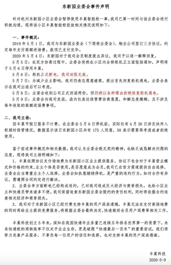 针对杭州东新园小区因不满丰巢快递柜收费而暂停使用一事,5月9日下午,深圳市丰巢科技有限公司(简称“丰巢科技”)发布《东新园业委会事件声明》。