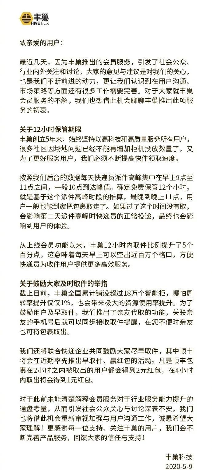 5月9日晚,丰巢智能柜微信公众号发布致用户信:将联合快递企业共同鼓励大家尽早取件,顺丰近期将率先推出早取件、赢红包活动,凡顺丰包裹在2小时内被取出的用户都会得到2元红包,4小时内取出将得到1元红包。
