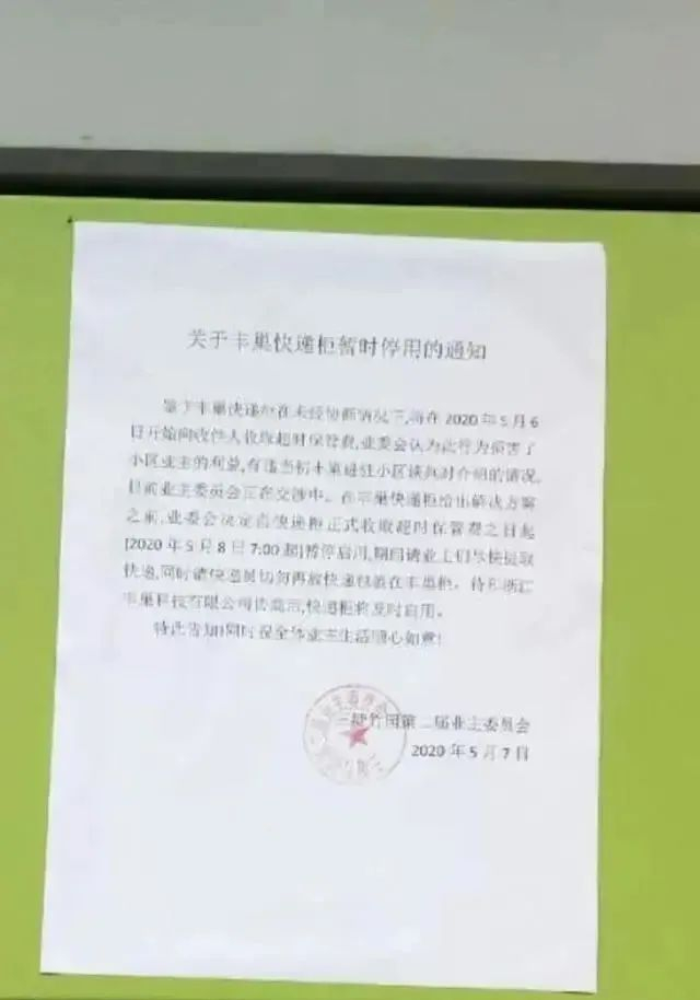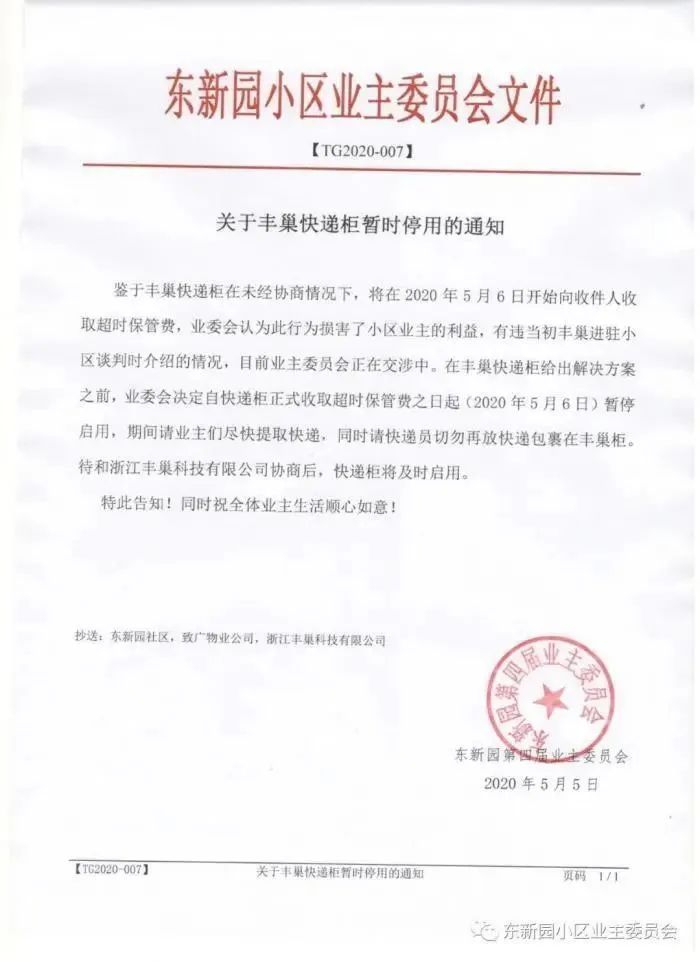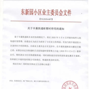 5月5日,杭州东新园小区业主委员会在其官方微信公号上发通知,提出:鉴于丰巢快递柜在未经协商的情况下,将从5月6日开始向收件人收取超时保管费,业委会认为此行为损害了小区业主的利益,有违当初丰巢进驻小区谈判时介绍的情况。在丰巢快递柜给出解决方案之前,业委会决定自快递柜正式收取超时保管费之日起(2020年5月6日)暂停使用。