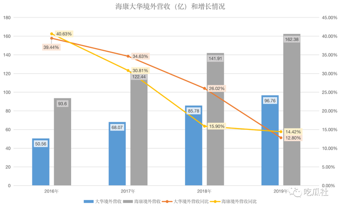 不过,海康和大华在海外业务的毛利率普遍比国内业务高出近10个百分点。相对应的,大华在海外营收的增速和整体一样,2019年出现大幅下降,但海康从2018年开始,增速就一直保持在15%左右,2019年略有下滑。