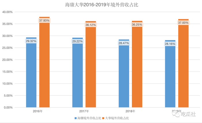 在营收的区域分布上,海康和大华都属于出海较早的中国企业,境外营收也作为单独科目披露。从占总营收比例来看,大华的境外营收占比达到37%左右,比海康多出8~10个百分点。