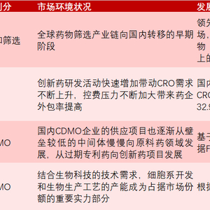 而国内需求的快速增长以及全球产业链的转移共同驱动国内CRO/CMO行业的发展。这些因素共同影响了整体行业的发展,而具体企业对这些因素的响应性也将决定这些企业对市场的适应度和自身发展的情况。