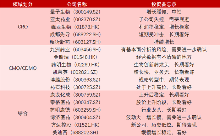 根据主要营收的板块,这些上市公司可分为,CRO大类下:药物发现:成都先导,维亚生物;临床前CRO:亚太药业,量子生物,昭衍新药;临床CRO:*ST百花;小分子和大分子CMO/CDMO:九洲药业,凯莱英,博腾股份,药明生物,金斯瑞,药石科技;综合型公司包括:博济医药,药明康德,方达控股,泰格医药,康龙化成,美迪西等。