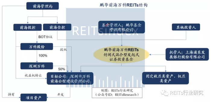 当然,“鹏华前海万科REITs”在交易结构与海外标准REITs存在一定差异。一是本产品受限于《证券投资基金运作管理办法》中关于公募基金持有单一公司集中度的相关规定,只能以不超过50%的资产配置在商业物业股权上,未体现出商业地产投资基金的行业特征;二是基金投资标的虽为前海企业公馆项目公司股权,但并未实际控制前海企业公馆物业产权(注:根据招募说明书,前海企业公馆项目为BOT项目,即由万科出资建设前海企业公馆,并通过8年的运营来回收项目投资,最后再无偿移交给前海管理局。因此,前海企业公馆项目公司仅拥有前海企业公馆项目自2013年9月8日至2021年9月7日期间的收益权,并不拥有前海企业公馆项目物业产权)。
