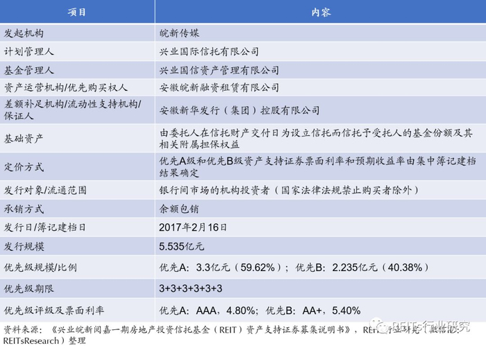 皖新光大阅嘉REITs由光大证券股份有限公司作为牵头安排人和销售机构,光大保德信资产管理有限公司作为计划管理人。本单产品的发行规模为5.55亿,A类证券发行规模3.55亿元,被中诚信证评授予AAA评级,B类证券发行规模2.00亿元,AA+评级。